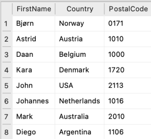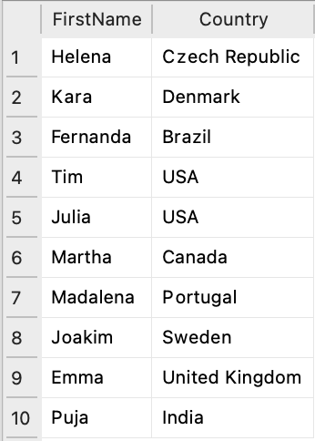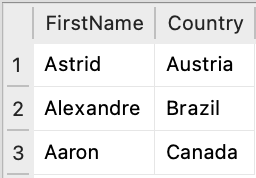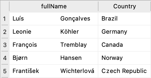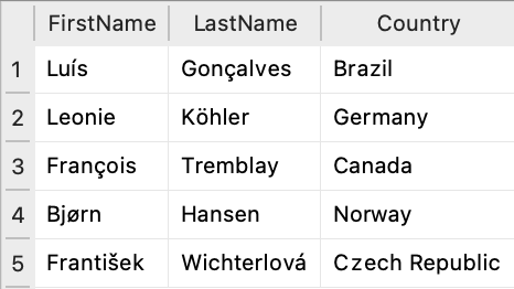 - query ด้านล่างเราจะดึงคอลัมน์ firstname, lastname และ country ในตาราง customers และ ใช้ LIMIT เพื่อกำหนดจำนวนแถว 5 แถว