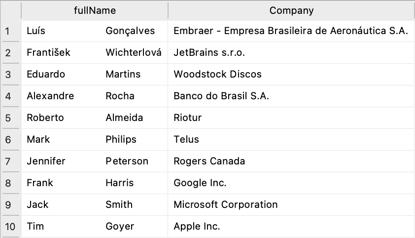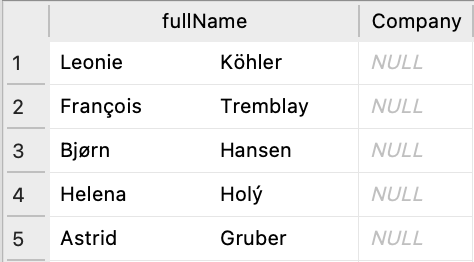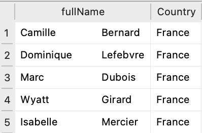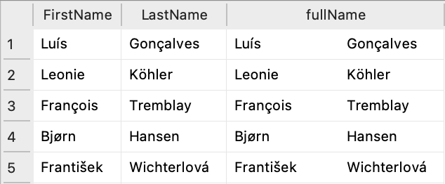 - query ด้านล่างเราจะดึงคอลัมน์ firstname, lastname จากตาราง customers และ นำ 2 คอลัมน์มา merge เข้าด้วยกันด้วยเครื่องหมาย Pipe และ ตั้งชื่อ คอลัมน์ใหม่ว่า fullName