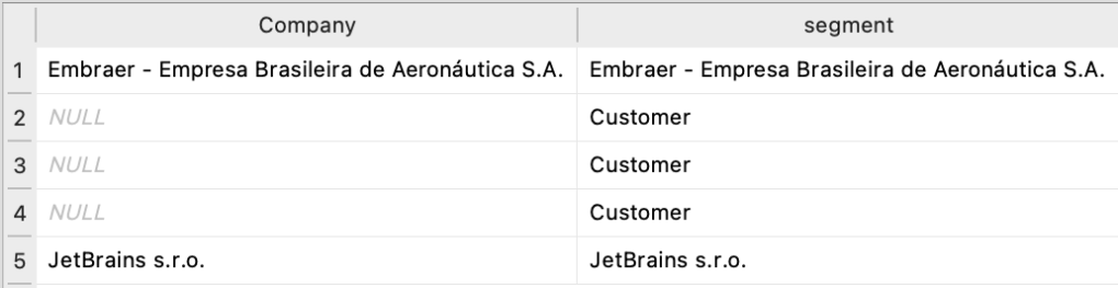 - query ด้านล่างเราจะฟิลเตอร์เฉพาะบริษัทที่ไม่มีค่า NULL