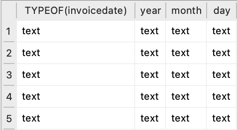 TYPEOF(STRFTIME('%Y', invoicedate)) AS year,
