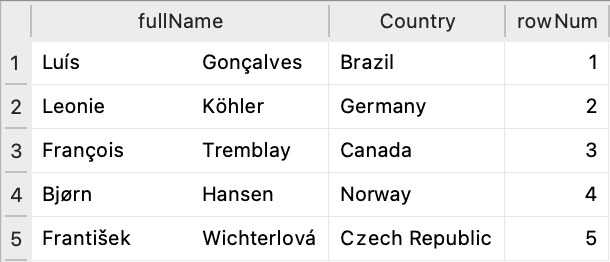 - query ด้านล่าง เราดึงคอลัมน์ firstname และ lastname มา merge เข้าด้วยกัน และ ดึงคอลัมน์ country และ ใช้ ROW_NUMBER( ) หนึ่งใน window functions เพื่อสร้างเลขแถว เดี๋ยวจะมาอธิบายเรื่อง window function อีก part นึง