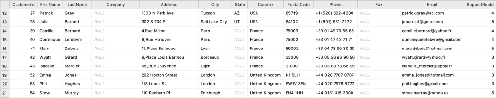- query เราดึงทุกคอลัมน์จากตาราง customers ฟิลเตอร์เฉพาะลูกค้าที่อาศัยอยู่ในประเทศฝรั่งเศษ