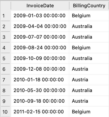 - query ด้านล่างเราจะดึงคอลัมน์ invoicedate และ billingcountry จากตาราง invoices และ ฟิลเตอร์คอลัมน์ billingcountry ที่ชื่อประเทศอยู่ระหว่าง Australia และ Belgium