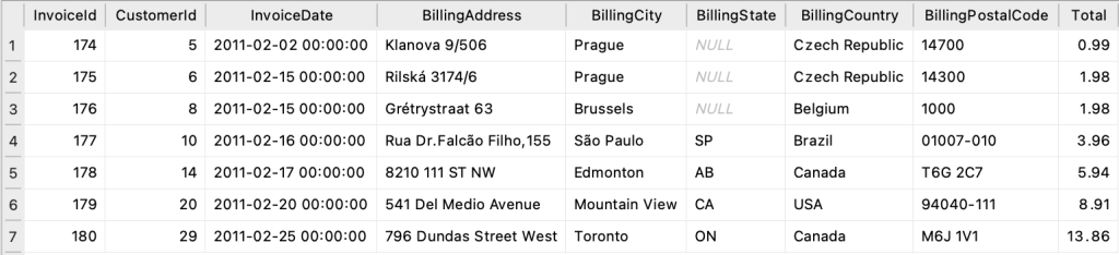 - query ด้านล่างเราจะ เลือกทุกคอลัมน์ในตาราง invoices และฟิลเตอร์เฉพาะเดือนที่ 2 ของปี 2011