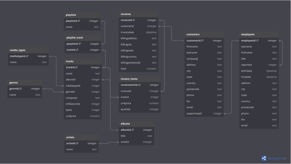 - มีทั้งหมด 11 ตาราง ใน Database เราจะเรียก “Entity” ชื่อตารางจะอยู่ในกรอบสีเทาอ่อนด้านบนสุด และ แต่ละตารางก็จะมีหลายคอลัมน์ ใน Database เราจะเรียก“Attribute” เช่น ตาราง tracks มีทั้งหมด 9 คอลัมน์
