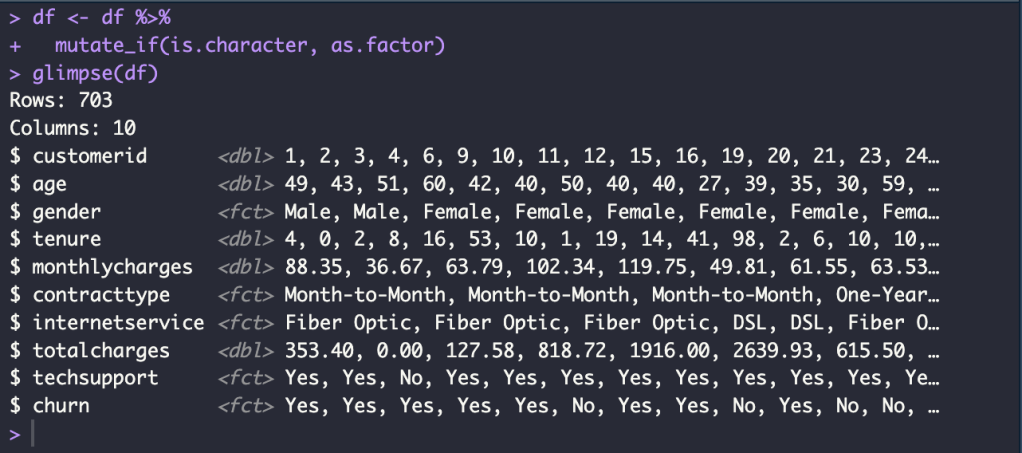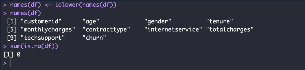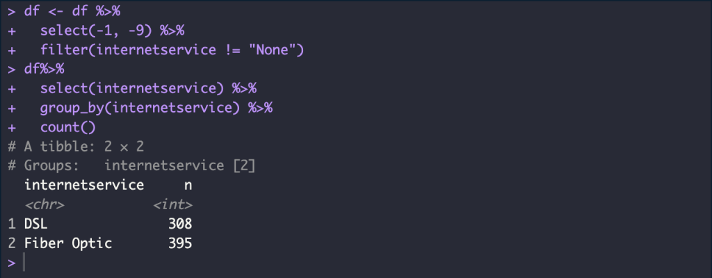 Create a new data frame without the customerid and techsupport column and Removes all rows containing “None” values