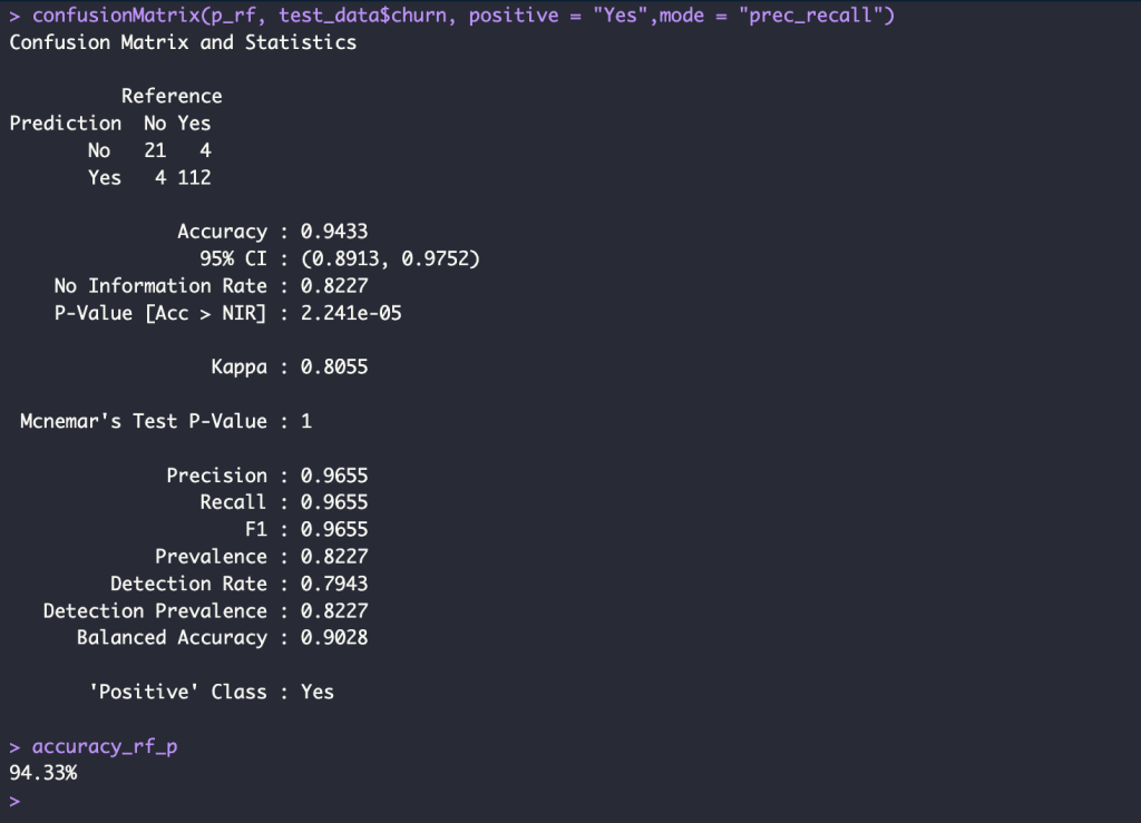 accuracy_rf <- round(mean( p_rf == test_data$churn), 4) * 100