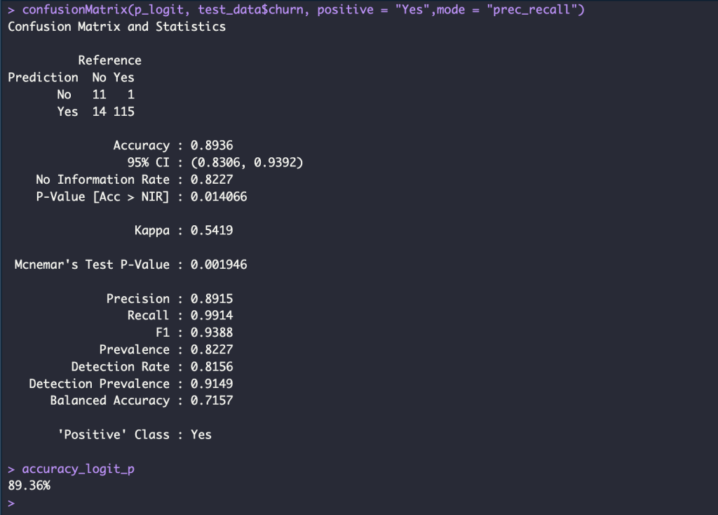 accuracy_logit <- round(mean( p_logit == test_data$churn), 4)*100