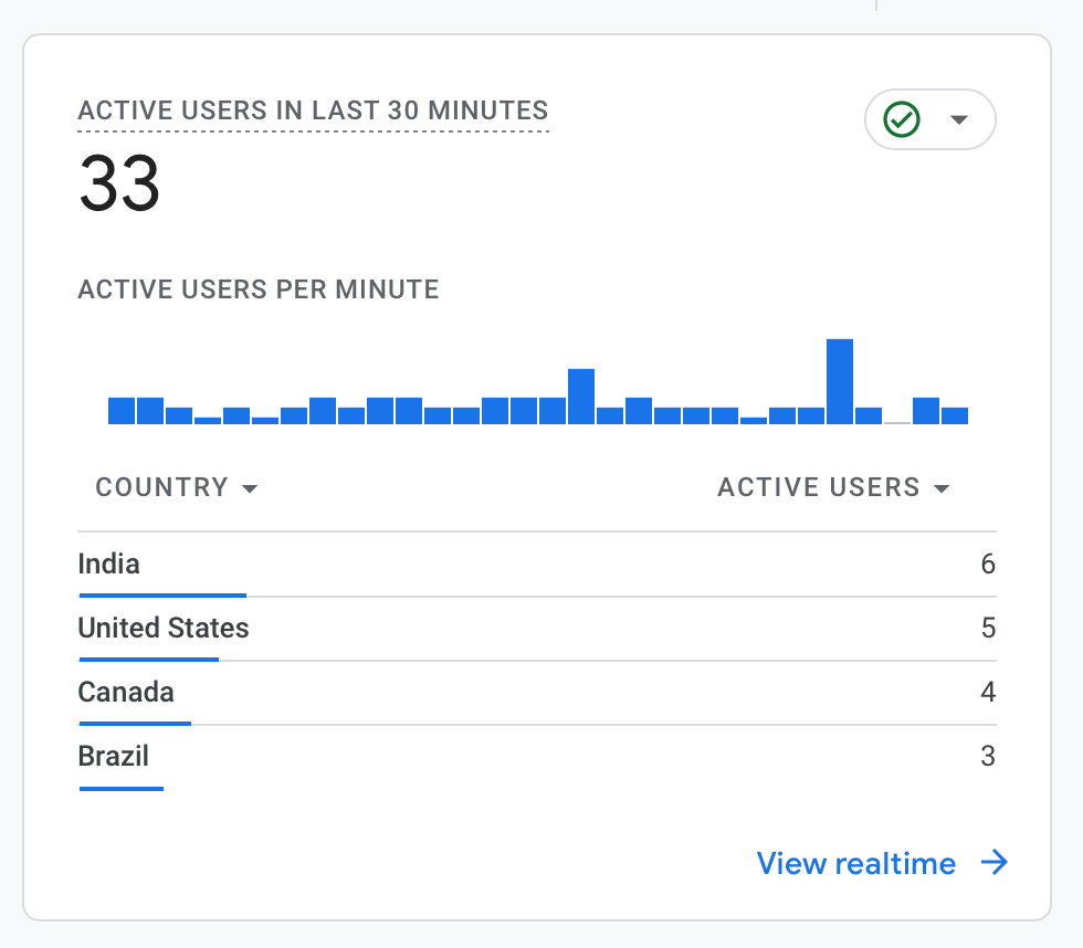 แสดงผลจำนวน Active Users 30 นาทีล่าสุด เป็นกราฟแท่ง แท่งละนาที และแบ่งตามประเทศที่ผู้ใช้งานเว็ปไซต์อยู่ เพื่อบอกว่าแต่ละประเทศมี Active Users ที่เข้ามาใช้งานเว็ปไซต์ของเราเป็นจำนวนเท่าไหร่ ส่วนนี้เราก็สามารถปรับเปลี่ยนได้เช่นเดียวกับ Overview