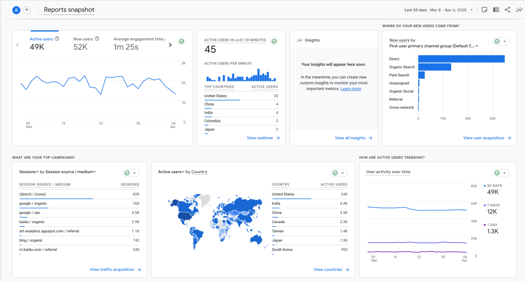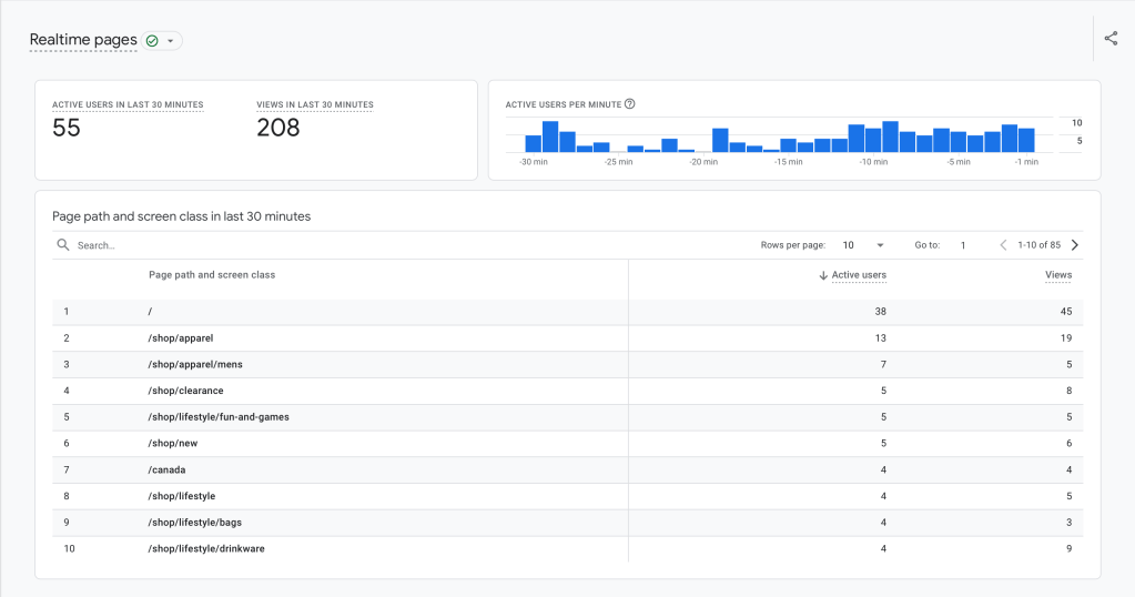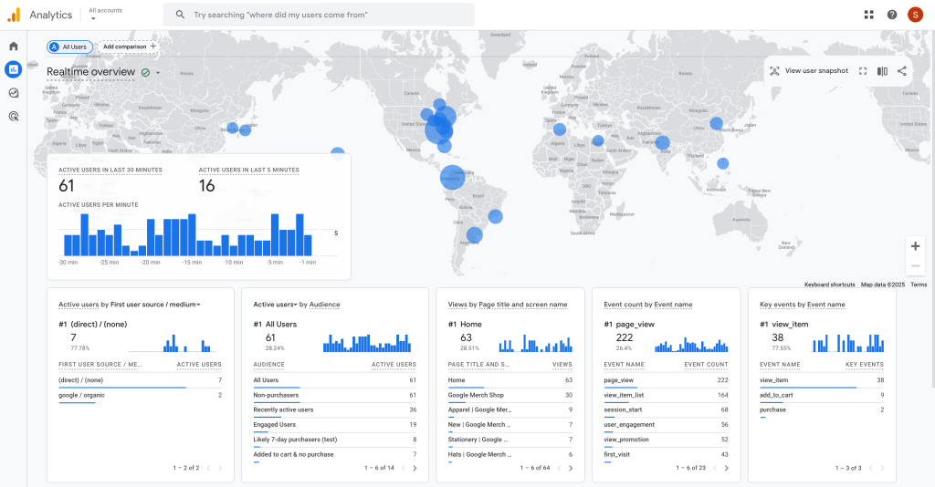 แสดงข้อมูลของผู้ใช้งาน 30 นาทีล่าสุด ในรูปแบบของ GEO map และยังบอกข้อมูลอื่นๆด้วย เช่น จำนวน Active Users, New Users และ ช่องทางที่พาผู้ใช้งานเข้ามายังเว็ปไซต์ของเรา เป็นต้น