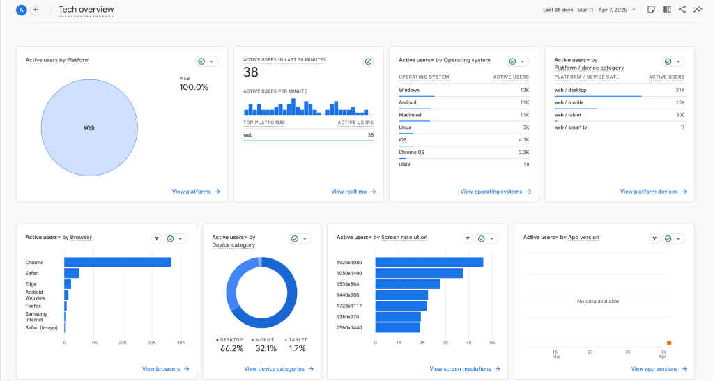 แสดงข้อมูลอุปกรณ์ของผู้ใช้งาน เช่น Platform, Operating System, Platform / Device Category, Browser, Device Category และ Screen Resolution