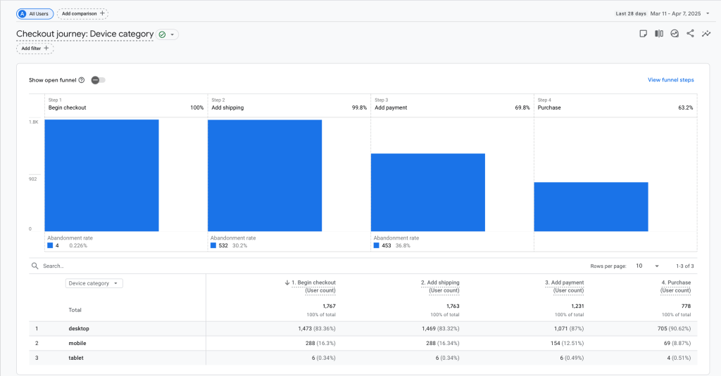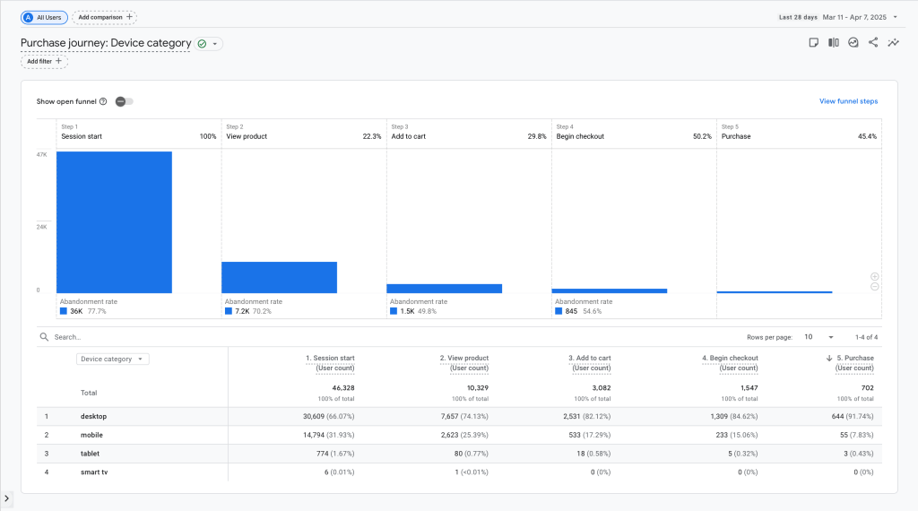 จากภาพด้านบนตั้งแต่ Add payment ไปจนถึง Purchase ลดลงอย่างมีนัยยะ เราอาจจะไป ตรวจสอบต่อว่าเว็ปไซต์ของตรงขั้นตอน Add payment นั้นมีปัญหาไหม ถ้ามีเราก็จะได้รีบแก้ไขเพื่อที่จะได้ไม่เสียฐานลูกค้าไป